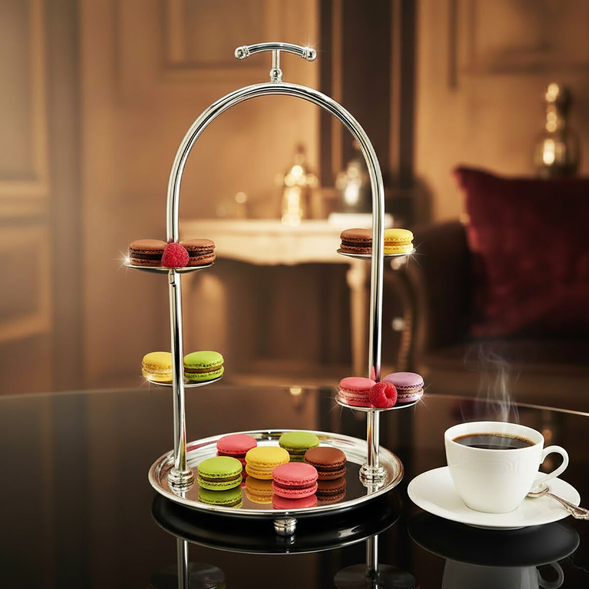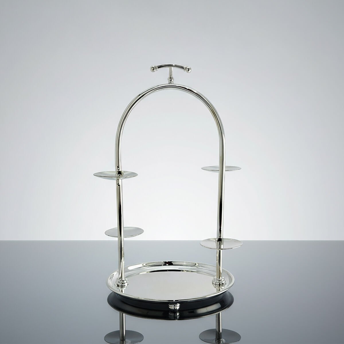 Handcrafted for The Grand Line Collection, the GRAND Afternoon Stand – VR 127 is defined by its elegant semi-arch silhouette and multi-level presentation structure. The micron silver-plated copper body reflects light with refined brilliance, while the graduated platforms create a balanced rhythm for pastry and tea-time service. Designed for luxury hospitality, afternoon tea rituals, pâtisserie displays and fine dining environments, it functions as a sculptural centrepiece that enhances vertical presentation.
