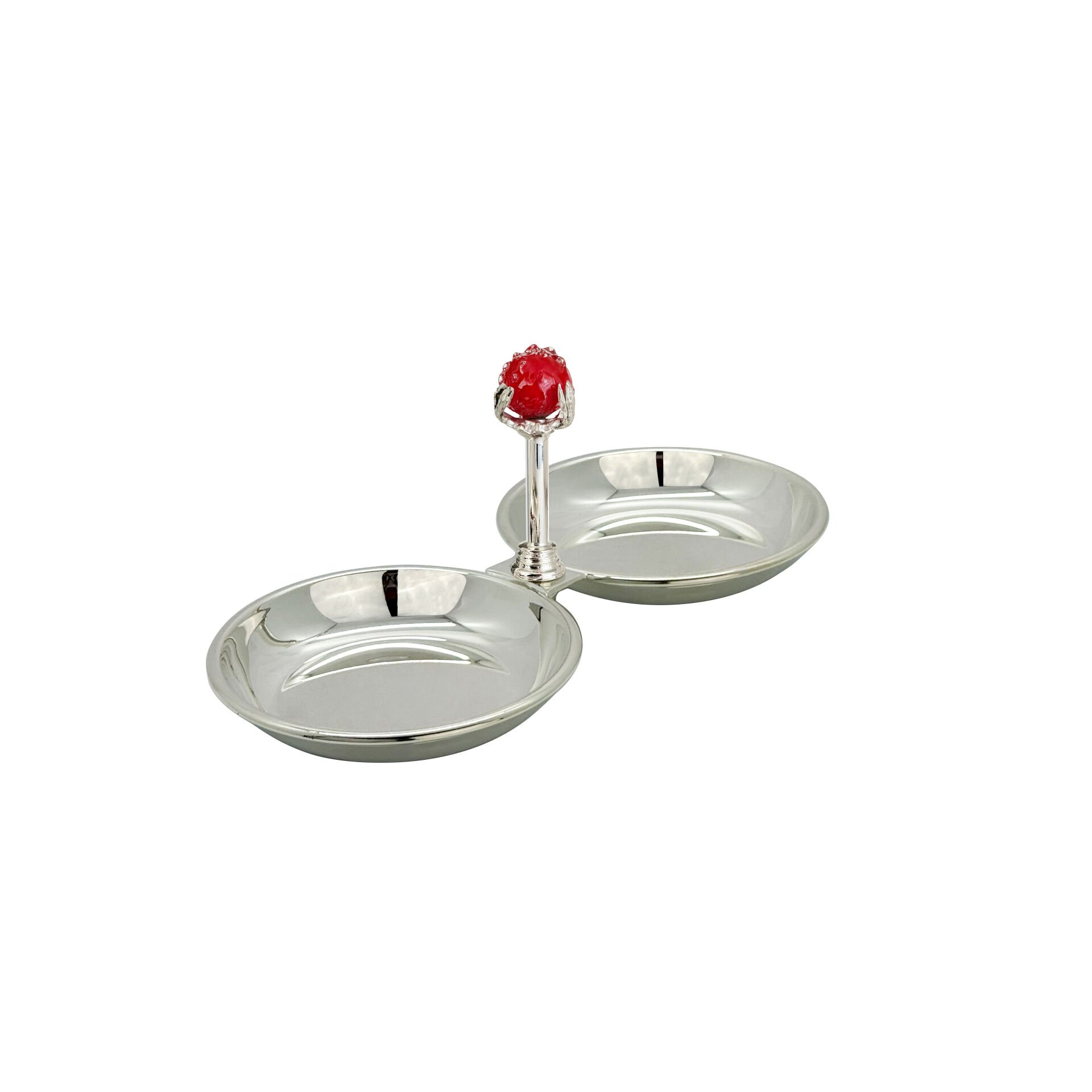 Handcrafted dual serving bowl from The Grand Holiday Red Edition. Design Code: NL 118 Finish: Micron Silver on Copper / Symmetric Handle Form By Garni Desig House – Istanbul