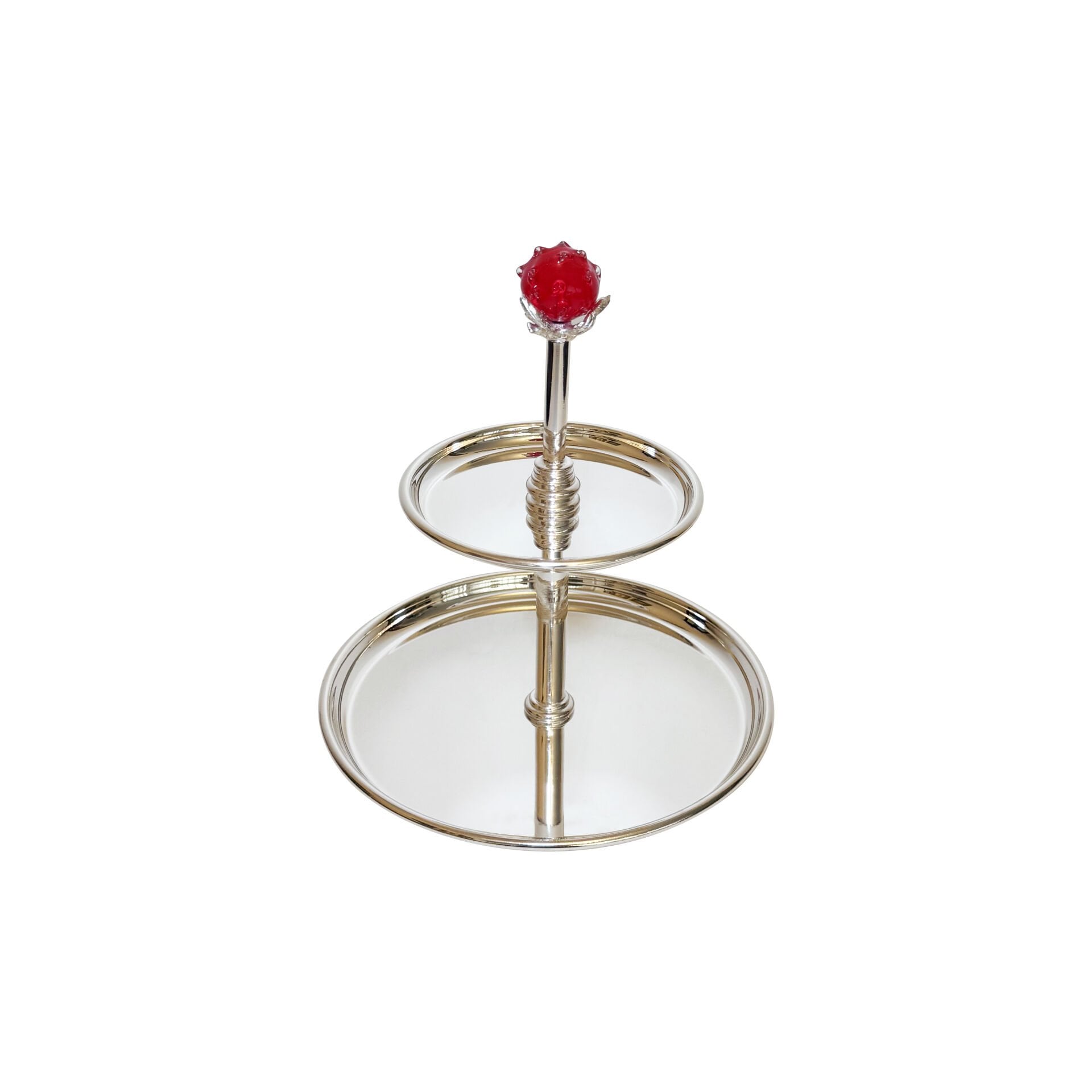 Handcrafted two-tier serving stand from The Grand Holiday Red Edition Design Code: NL-114 Finish: Micron Silver on Copper / Brushed Steel Handle By Garni Desig House – Istanbul