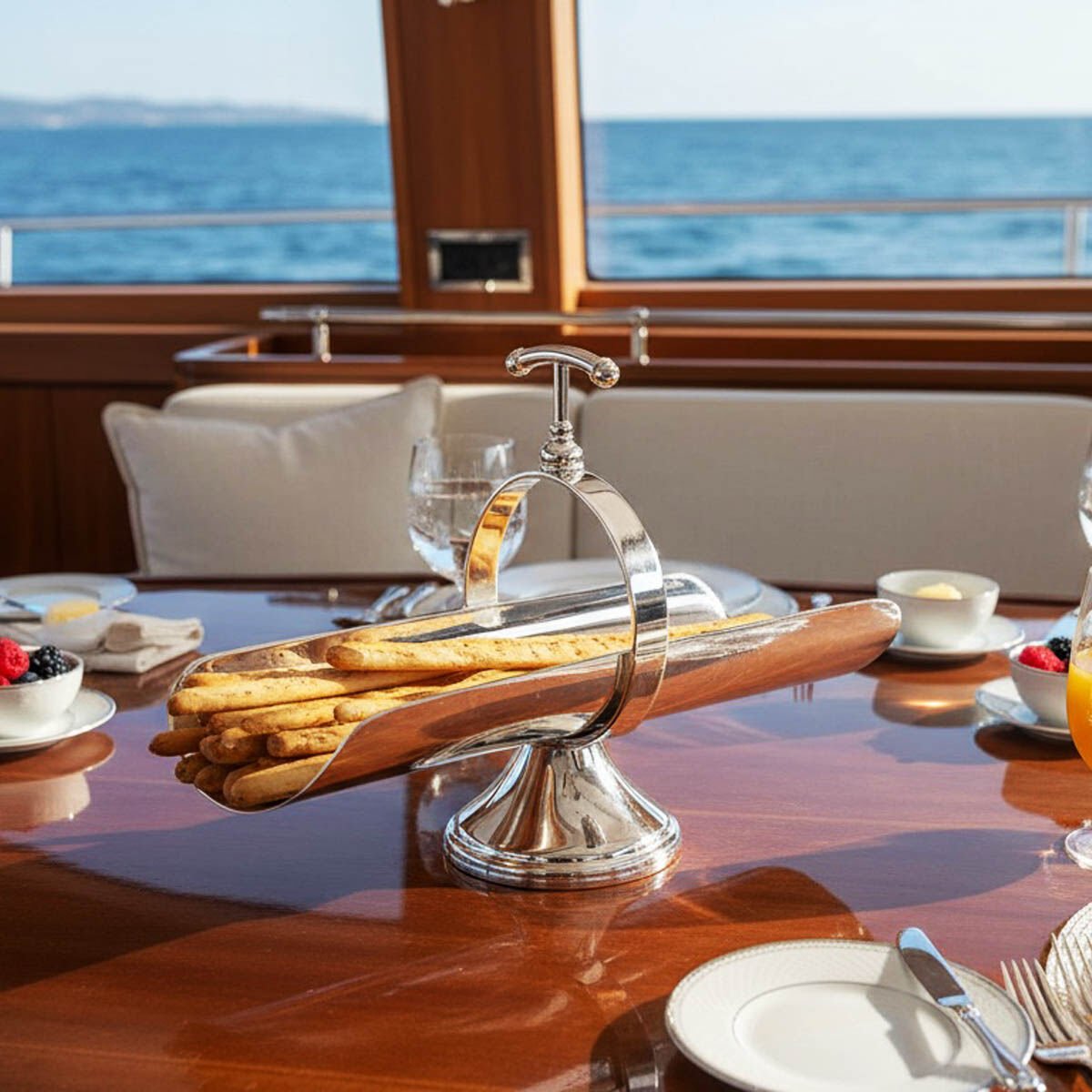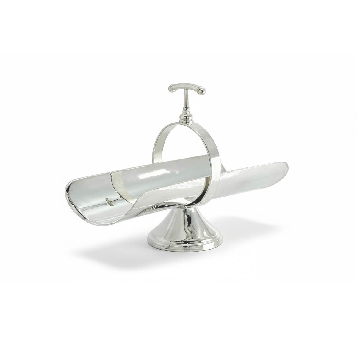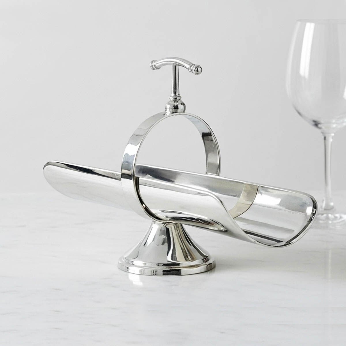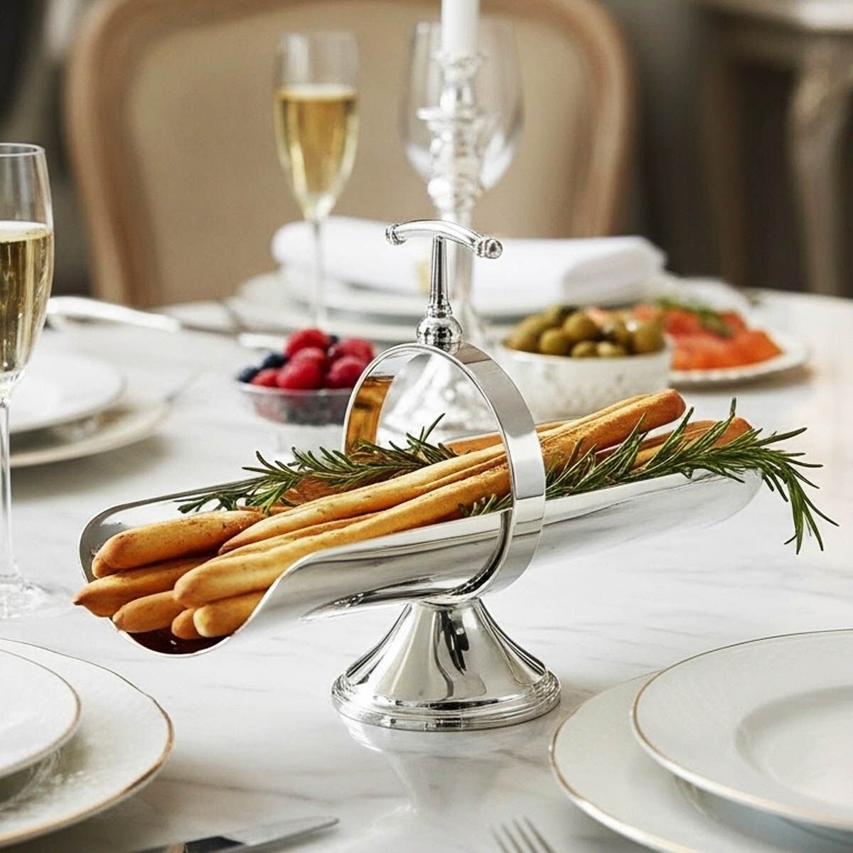Handcrafted with a micron silver-plated copper body, the VR 120 grissini stand introduces an architectural sense of height to fine dining presentations through its elevated sculptural pedestal base. Its strong vertical presence enhances the visual experience of table service.