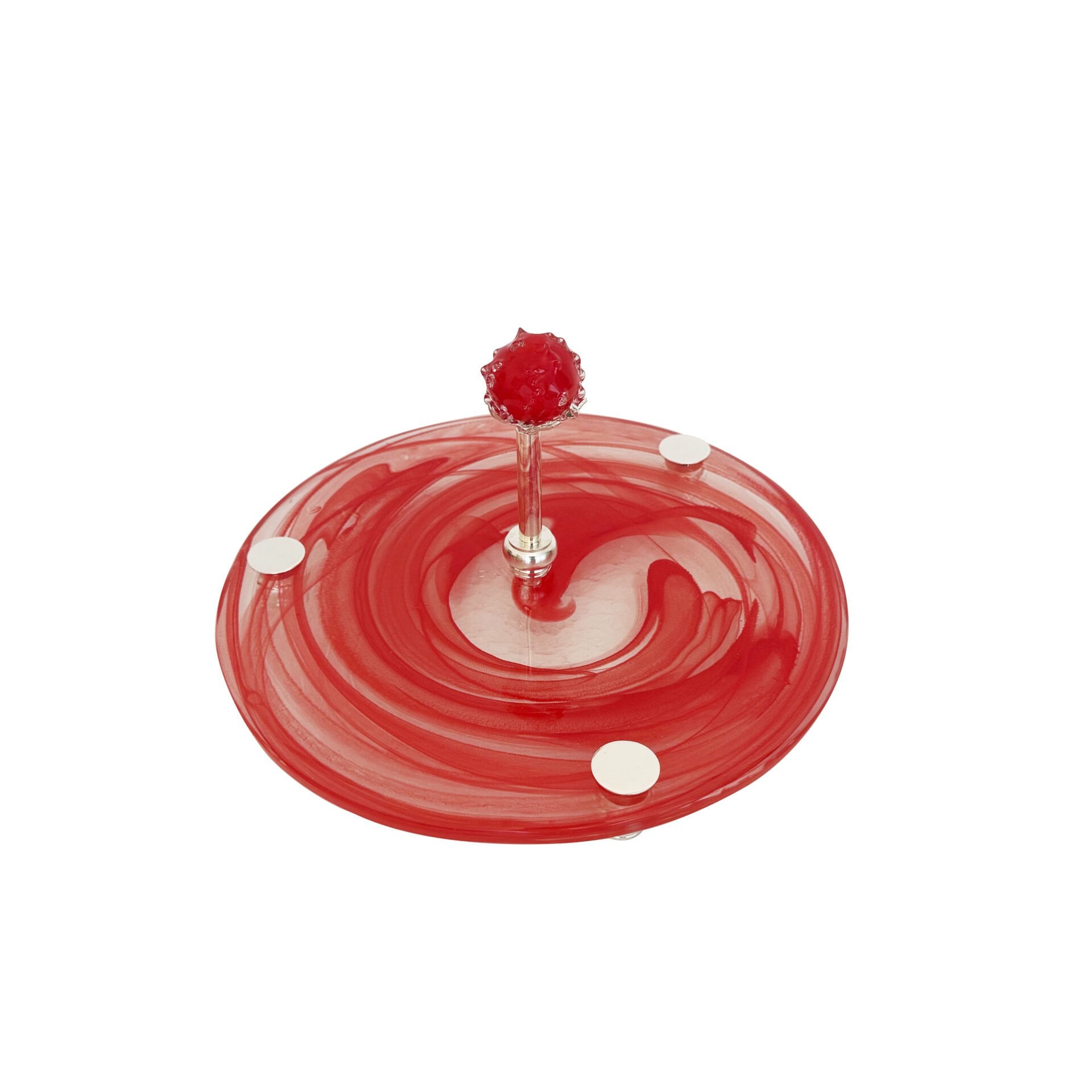 Handcrafted single-tier glass plateau from The Grand Holiday Red Edition. Design Code: NL 116 Material: Frosted Glass / Micron Silver Handle & Base Details By Garni Desig House – Istanbul